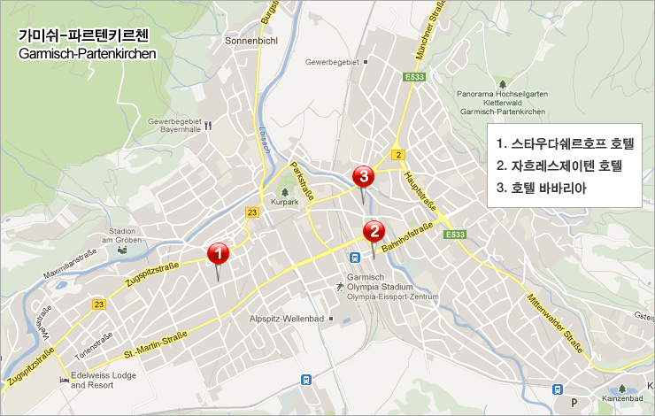 °¡¹Ì½¬-ÆÄ¸£ÅÙ۸£Ã¾(Garmisch-Partenkirchen) ºô¸®Áö¿¡ À§Ä¡ÇÑ °¢ È£ÅÚÀÇ À§Ä¡¸¦ º¸¿©ÁÖ´Â ÁöµµÀÔ´Ï´Ù. À̰÷¿¡ ³ª¿ÍÀÖ´Â °¢ È£ÅÚÀº ½ºÅ°½ºÅ° ´å ÄÄ¿¡¼ ¼±Á¤ÇÏ¿© »ç¿ëÇÏ´Â ÃÖ°íÀÇ ½Ã¼³°ú °¡Àå ÁÁÀº °÷¿¡ À§Ä¡Çϰí ÀÖ½À´Ï´Ù.