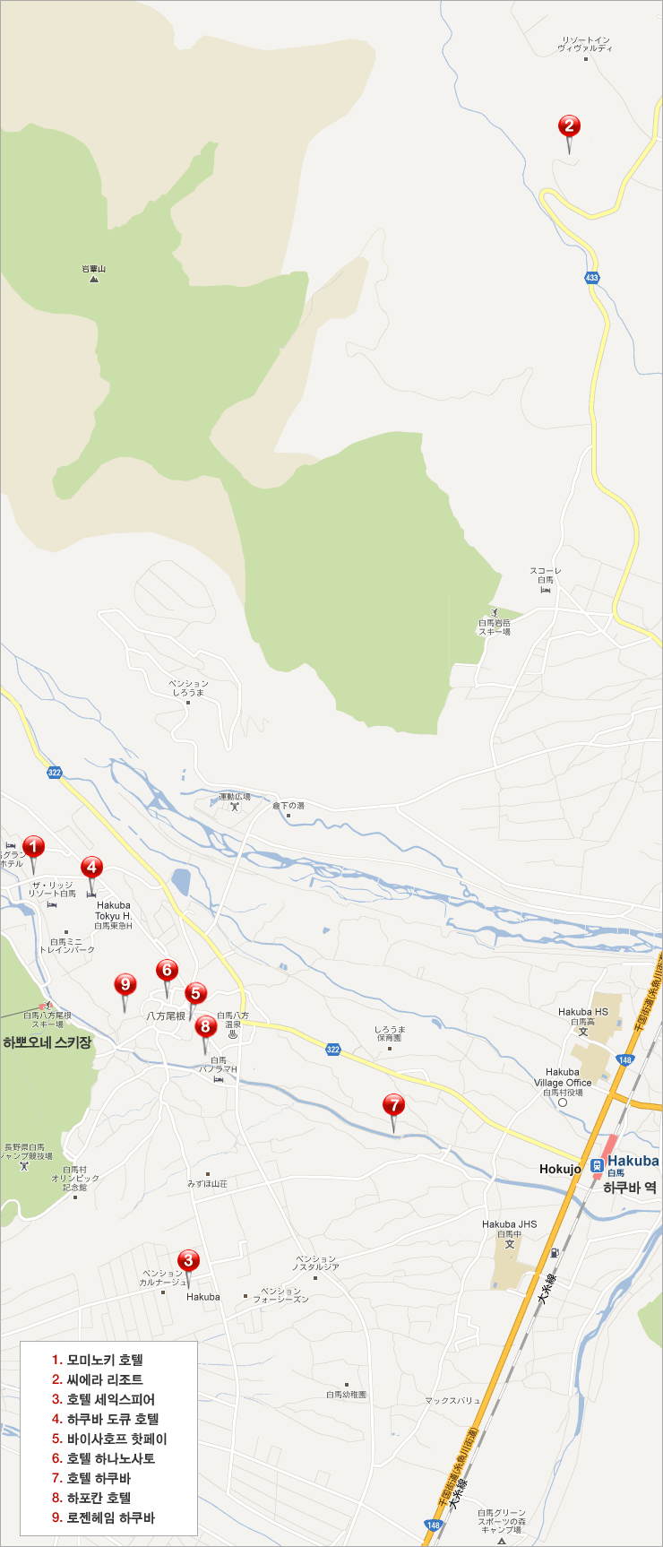 ÇϻǿÀ³× ½ºÅ°ÀåÀÇ º£À̽º Áö¿ªÀÎ ÇÏÄí¹Ù(Hakuba) ¸¶À»¿¡ À§Ä¡ÇÑ °¢ È£ÅÚµéÀÇ À§Ä¡ Áöµµ ÀÔ´Ï´Ù.